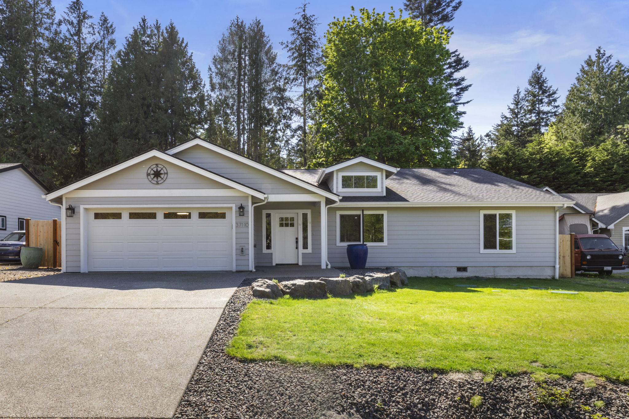 Located in the sought-after Driftwood Key community, this beautifully crafted 2023 single-level home offers modern comfort just a short walk to the waters edge. Enjoy ZERO steps living from the driveway through the entire interior for ease of access. Vaulted ceilings enhance the open-concept great room, highlighted by a unique easterly-facing gabled dormer window that brings in soft morning light. The kitchen features contemporary cabinetry, stainless steel appliances, a generous pantry, and quartz countertops that carry through the home for a cohesive, upscale finish. The primary suite is privately positioned on the opposite side of the home from the two additional bedrooms and includes a walk-in closet, ensuite bath, and an extra linen closet for added organization. A spacious laundry room and attached two-car garage add everyday functionality. The fully fenced yard and desirable RV parking offer flexibility for recreation and storage. Wired for a generator and designed for easy living, with access to Driftwood Key amenities including the marina, clubhouse, pool, private beach, waterfront pavilion, playground, and boat launch, this home is ideal for full-time living or a relaxed coastal retreat.
