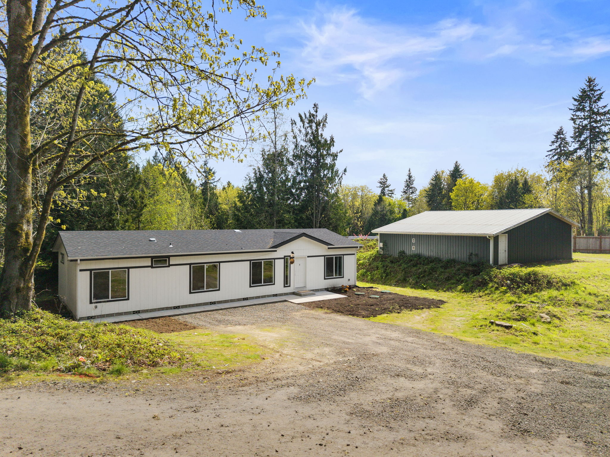 Nearly-new 1,566 sq ft home set on 2.5 peaceful acres, offering space, privacy, and modern finishes just minutes from Kingston. This 3-bedroom, 1.75-bath home features an open layout with elevated finishes including stainless steel appliances, quartz countertops, contemporary lighting, and a huge pantry for exceptional storage. Two separate living areas provide flexibility for relaxing, entertaining, or working from home. The primary suite is privately situated on the opposite side of the home from the two guest bedrooms, offering added separation and comfort. The property is well-suited for those needing space for hobbies or equipment, highlighted by a 36x36, 1,296 sq ft insulated and powered 3-car garage or workshop with 200 amp service, plus a 12x12 shed and ample RV or boat parking. Enjoy the balance of a quiet, rural setting with convenient access to Kingston ferries including the fast ferry to Seattle, schools, restaurants, beaches, and trails. No HOA. A versatile property with room to live, work, and play!
